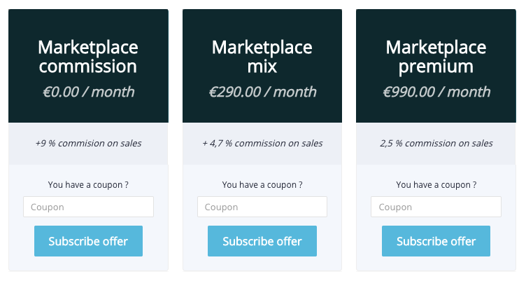 In addition, this model allows the operator to define several offers in order to give a wider choice to sellers. For example, the operator could define three offers: a free offer allowing only ten products on the marketplace, a basic offer at $50/month to add 100 products and a premium offer more expensive with unlimited access to the features. That way, sellers can choose how they want to use the platform and pay the right amount.